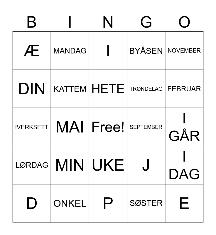 This bingo card has a free space and 87 words: DRA, MÅNED, UKE, DAG, ÅR, GAMMEL, BURSDAG, BO, FRA, NÅR, 2./ANDRE, NR. 1, I DAG, I GÅR, I MORGEN, HETE, ETTERNAVN, HA, FAMILIE, 8 ÅR (GAMMEL), KLAR, OPPFATTE, IVERKSETT, BESTEFAR, SØSTER, BROR, MOR, FAR, FORELDRE, TANTE, ONKEL, STEMOR, HALVSØSKEN, MIN, DIN, JANUAR, FEBRUAR, MARS, APRIL, MAI, JUNI, JULI, AUGUST, SEPTEMBER, OKTOBER, NOVEMBER, DESEMBER, MANDAG, TIRSDAG, ONSDAG, TORSDAG, FREDAG, LØRDAG, SØNDAG, NORGE, TRONDHEIM, TRØNDELAG, MELHUS, RANHEIM, BYÅSEN, KATTEM, NARDO, HEIMDAL, KLÆBU, ORKANGER, A, B, D, E, F, G, H, I, J, K, M, N, P, R, S, T, U, W, Y, Z, Æ and Å.