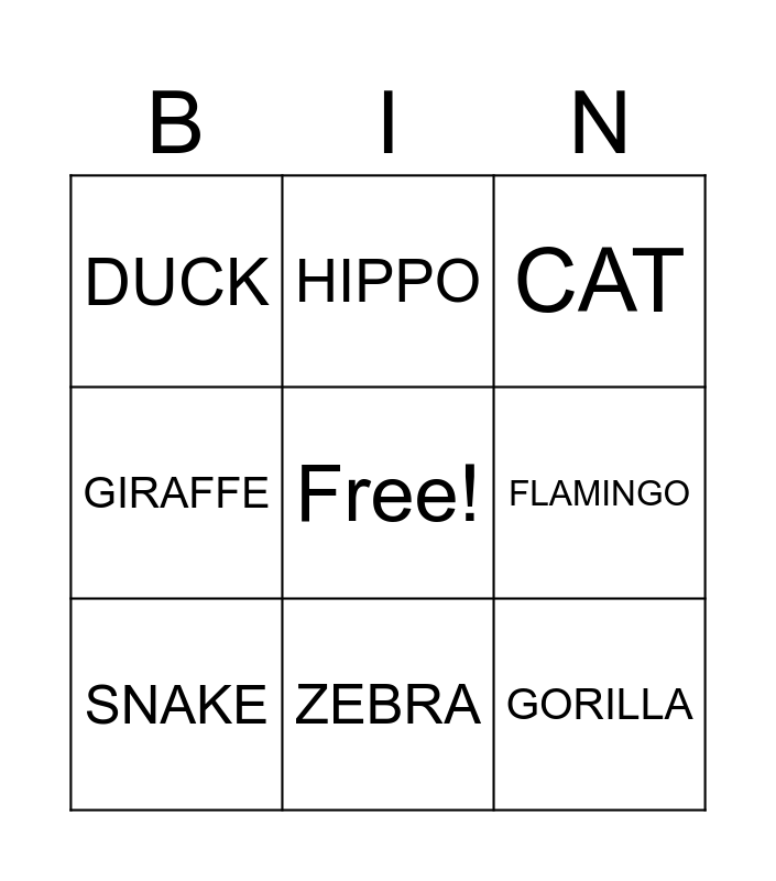 This bingo card has a free space and 18 words: ELEPHANT, DOG, CAT, DUCK, FROG, GIRAFFE, LION, HIPPO, ZEBRA, CROCODILE, BIRD, GORILLA, MONKEY, FLAMINGO, SNAKE, FISH, PARROT and RABBIT.