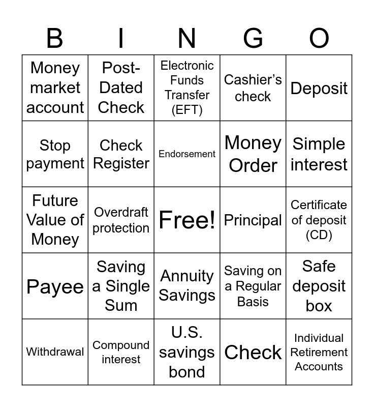 This bingo card has a free space and 34 words: Checking Account, Check, Drawer, Drawee, Payee, Check Register, Deposit, Withdrawal, Post-Dated Check, Debit Card, Endorsement, Electronic Funds Transfer (EFT), Bank Reconciliation, Liquid, Principal, Simple interest, Compound interest, Future Value of Money, Saving a Single Sum, Saving on a Regular Basis, Annuity Savings, Present Value of Money, Money market account, Certificate of deposit (CD), U.S. savings bond, Individual Retirement Accounts, Cashier’s check, Certified check, Money Order, Stop payment, Smart card, Overdraft protection, Safe deposit box and Loans.