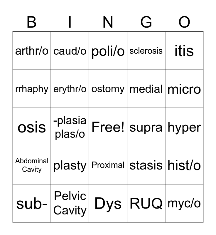 This bingo card has a free space and 79 words: Algia, cyan/o, poli/o, melan/o, leuk/o, dynia, myel/o, oste/o, my/o, neur/o, ectomy, rrhea, sclerosis, arthr/o, gram, rrhaphy, rrhage, plasty, pre, hyper, hypo, itis, osis, ostomy, erythr/o, Pathology, ab-, dextro, sinistro-, macro-, micro, post-, Dys, inter, sub-, supra, ad-, eu-, arteri/o, myc/o, pyel/o, pyr/o, aden/o, adip/o, anter/o, caud/o, cephal/o, cyt/o -cyte, end-, exo-, hist/o, -plasia plas/o, stasis, anatomical, dorsal, Ventral, Transverse Plane, Midsagital plane, Frontal Plane, Proximal, medial, Lateral, Caudal, Cephalic, Cranial Cavity, Spinal Cavity, Dorsal Cavity, Ventral cavity, Thoracic Cavity, Abdominal Cavity, Pelvic Cavity, epigastric region, ubilicus, perotinium, Visceral peritonemum, RUQ, LUQ, GP and RLQ.