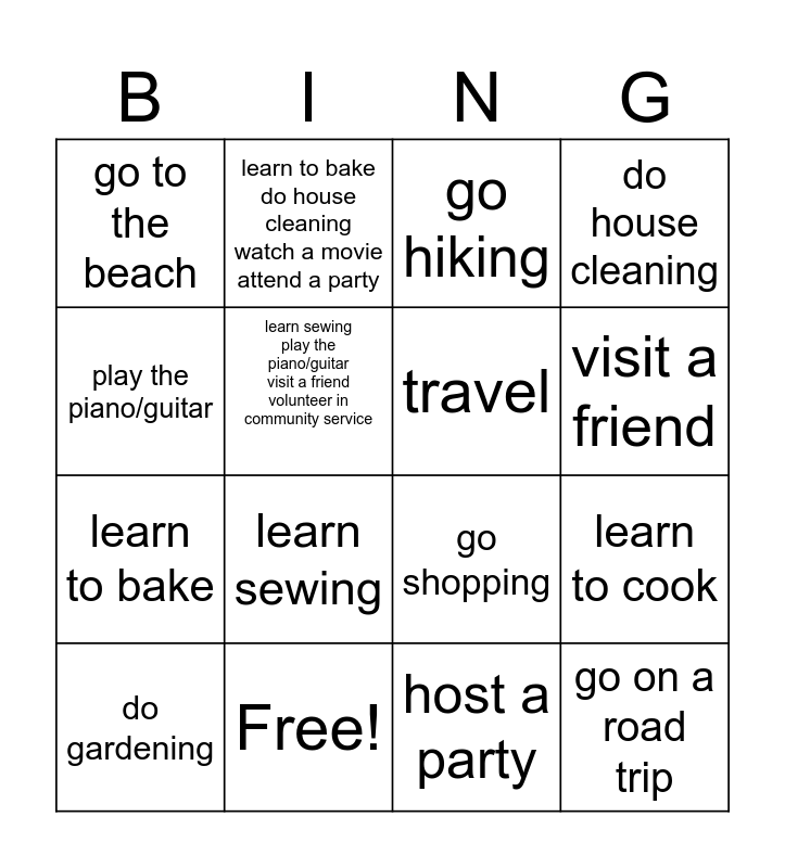 This bingo card has 22 words: Free!, travel go to the beach go hiking go shopping go on a road trip, learn to bake do house cleaning watch a movie attend a party, host a party relax at a spa learn to cook do gardening, learn sewing play the piano/guitar visit a friend volunteer in community service, travel, go to the beach, go hiking, go shopping, go on a road trip, learn to bake, do house cleaning, watch a movie, attend a party, host a party, relax at a spa, learn to cook, do gardening, learn sewing, play the piano/guitar, visit a friend and volunteer in community service.