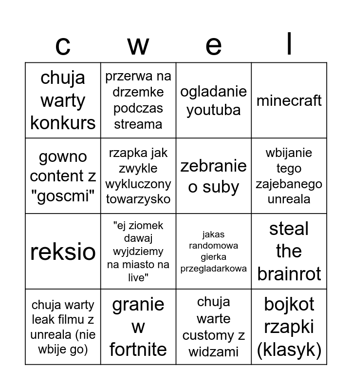 This bingo card has 16 words: granie w fortnite, steal the brainrot, ogladanie youtuba, chuja warty konkurs, reksio, przerwa na drzemke podczas streama, jakas randomowa gierka przegladarkowa, chuja warte customy z widzami, gowno content z "goscmi", rzapka jak zwykle wykluczony towarzysko, chuja warty leak filmu z unreala (nie wbije go), minecraft, "ej ziomek dawaj wyjdziemy na miasto na live", wbijanie tego zajebanego unreala, zebranie o suby and bojkot rzapki (klasyk).