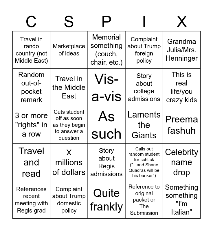 This bingo card has a free space and 35 words: Student answers a question for more than 7 seconds without interruption, Story about a Regis grad while they were at Regis, Exasperated "it's incredible, it's insane", with accompanying head motion, Travel in the Middle East, Story about Regis admissions, Complaint about Trump foreign policy, Random out-of-pocket remark, Have you read X book?, Vis-a-vis, Takes "both sides" but really only one, 3 or more "rights" in a row, Grandma Julia/Mrs. Henninger, Story about a Regis grad after they were at Regis, Evil or good sister/niece, Travel in rando country (not Middle East), Laments the Giants, Reference to original packet or The Submission, Cuts student off as soon as they begin to answer a question, Travel and read, Something something "I'm Italian", Calls out random student for schtick ("...and Shane Quadras will be his banker"), References recent meeting with Regis grad, Celebrity name drop, Complaint about Trump domestic policy, Memorial something (couch, chair, etc.), This is real life/you crazy kids, Westlake Wildcats/Dimo high school story, Speechwriter, playwright, or film writer memory, Story about college admissions, Preema fashuh, Yuge, Quite frankly, X millions of dollars, Marketplace of ideas and Famous or accomplished Regian name drop.