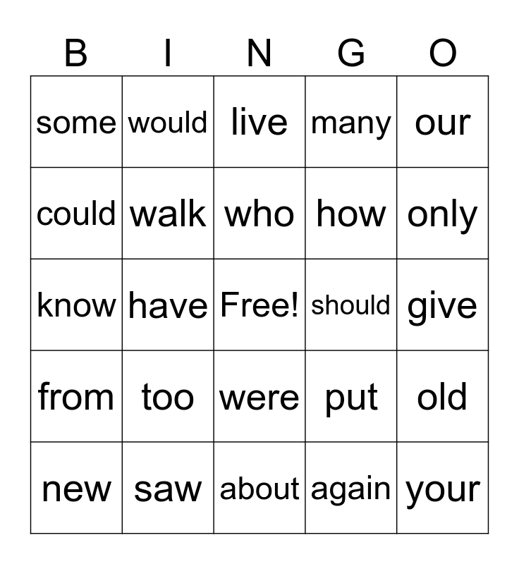 This bingo card has a free space and 24 words: too, saw, who, new, our, some, could, would, should, were, how, know, put, old, walk, again, give, live, only, have, your, from, many and about.