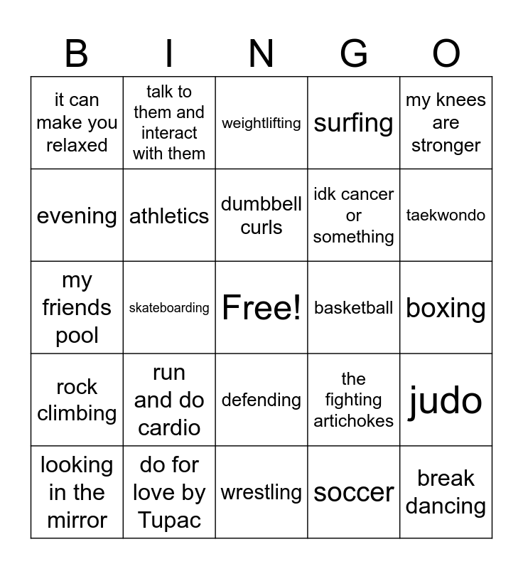 This bingo card has a free space and 24 words: run and do cardio, do for love by Tupac, dumbbell curls, looking in the mirror, my knees are stronger, it can make you relaxed, evening, talk to them and interact with them, basketball, defending, idk cancer or something, my friends pool, the fighting artichokes, judo, athletics, soccer, boxing, weightlifting, taekwondo, skateboarding, break dancing, rock climbing, surfing and wrestling.
