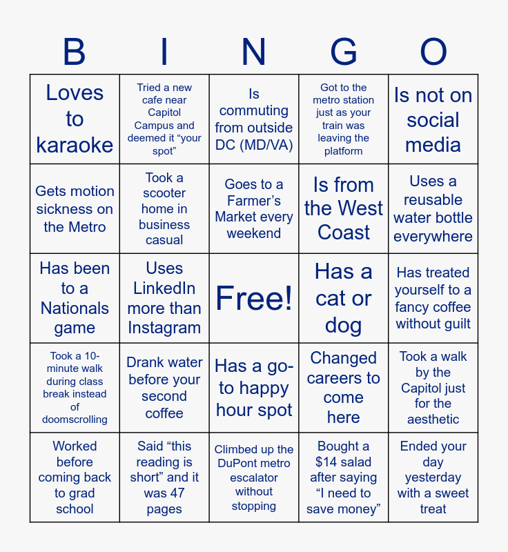 This bingo card has a free space and 24 words: Drank water before your second coffee, Said “this reading is short” and it was 47 pages, Goes to a Farmer’s Market every weekend, Worked before coming back to grad school, Is not on social media, Loves to karaoke, Gets motion sickness on the Metro, Tried a new cafe near Capitol Campus and deemed it “your spot”, Has a cat or dog, Has a go-to happy hour spot, Is from the West Coast, Has been to a Nationals game, Changed careers to come here, Took a walk by the Capitol just for the aesthetic, Took a scooter home in business casual, Bought a $14 salad after saying “I need to save money”, Has treated yourself to a fancy coffee without guilt, Is commuting from outside DC (MD/VA), Uses a reusable water bottle everywhere, Uses LinkedIn more than Instagram, Ended your day yesterday with a sweet treat, Took a 10-minute walk during class break instead of doomscrolling, Got to the metro station just as your train was leaving the platform and Climbed up the DuPont metro escalator without stopping.