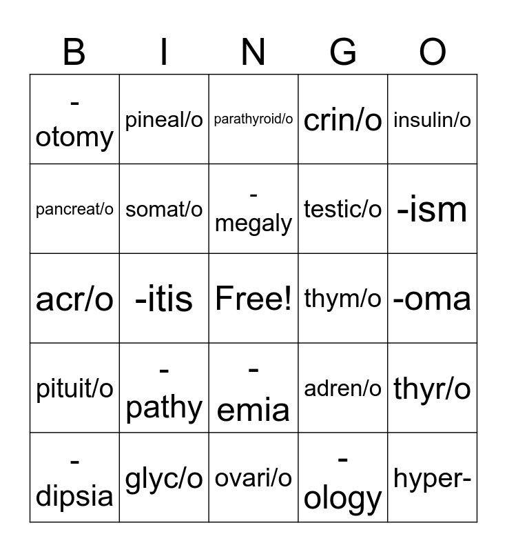 This bingo card has a free space and 27 words: adren/o, gonad/o, testic/o, ovari/o, pancreat/o, parathyroid/o, pineal/o, pituit/o, thym/o, thyr/o, acr/o, crin/o, -dipsia, glyc/o, -ism, poly-, somat/o, -megaly, -pathy, -otomy, -oma, -ology, -itis, hyper-, -emia, insulin/o and hypo-.