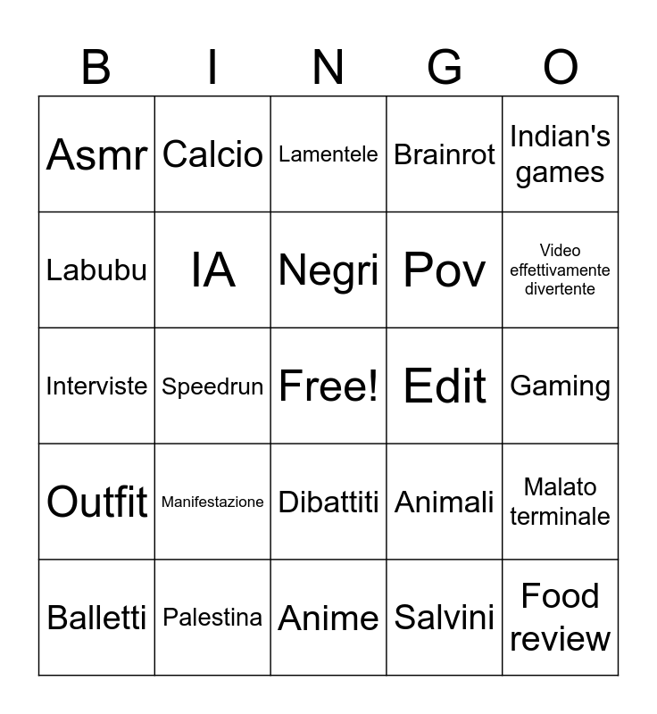 This bingo card has a free space and 24 words: Manifestazione, Palestina, Negri, Balletti, Indian's games, Asmr, Labubu, Calcio, Edit, Dibattiti, Pov, Interviste, Animali, Malato terminale, IA, Salvini, Gaming, Lamentele, Video effettivamente divertente, Speedrun, Food review, Outfit, Brainrot and Anime.