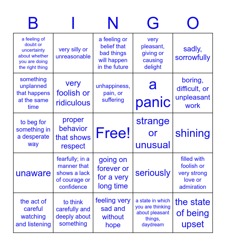 This bingo card has a free space and 29 words: the act of careful watching and listening, a transparent object that separates light into different colors, proper behavior that shows respect, going on a short journey for pleasure, a feeling of doubt or uncertainty about whether you are doing the right thing, a feeling or belief that bad things will happen in the future, very foolish or ridiculous, fearfully; in a manner that shows a lack of courage or confidence, strange or unusual, to think carefully and deeply about something, shining, the state of being upset, feeling very sad and without hope, a state in which you are thinking about pleasant things, daydream, boring, difficult, or unpleasant work, to do something that someone has asked you to do, going on forever or for a very long time, unaware, sadly, sorrowfully, to beg for something in a desperate way, seriously, to slow the movement or progress of something, stumped, a panic, something unplanned that happens at the same time, very pleasant, giving or causing delight, very silly or unreasonable, filled with foolish or very strong love or admiration, unhappiness, pain, or suffering and quiet and peaceful.