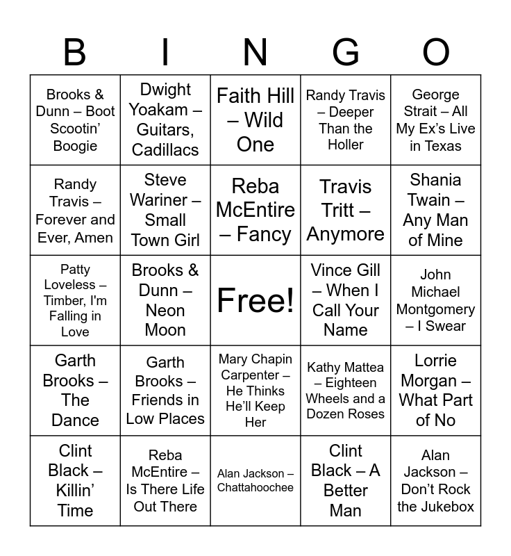 This bingo card has a free space and 25 words: Garth Brooks – Friends in Low Places, Alan Jackson – Chattahoochee, Reba McEntire – Fancy, Clint Black – Killin’ Time, George Strait – All My Ex’s Live in Texas, Brooks & Dunn – Boot Scootin’ Boogie, Randy Travis – Forever and Ever, Amen, Dwight Yoakam – Guitars, Cadillacs, Vince Gill – When I Call Your Name, Mary Chapin Carpenter – He Thinks He’ll Keep Her, Travis Tritt – Anymore, Patty Loveless – Timber, I'm Falling in Love, Kathy Mattea – Eighteen Wheels and a Dozen Roses, Lorrie Morgan – What Part of No, Steve Wariner – Small Town Girl, Charlie Daniels Band – The Devil Went Down to Georgia, John Michael Montgomery – I Swear, Faith Hill – Wild One, Shania Twain – Any Man of Mine, Brooks & Dunn – Neon Moon, Alan Jackson – Don’t Rock the Jukebox, Reba McEntire – Is There Life Out There, Garth Brooks – The Dance, Randy Travis – Deeper Than the Holler and Clint Black – A Better Man.