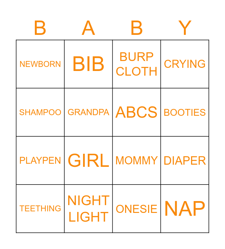 This bingo card has 60 words: TOWELS, TEDDY BEAR, NURSERY, NAP, ROCKING CHAIR, BLOCKS, ABCS, RATTLE, PLAYPEN, BASSINET, CRYING, GRANDMA, GRANDPA, INFANT, LOVE, NEWBORN, TEETHING, SHAMPOO, POWDER, BOOTIES, NIGHT LIGHT, BURP CLOTH, MOBILE, BROTHER, SISTER, NURSERY RHYME, LAUGHING, BOY, GIRL, MILK, BABY, SWING, CRAVINGS, TOYS, BIB, CRAWLING, BATH, DIAPER, DIAPER BAG, MOMMY, DADDY, BOTTLE, ONESIE, BLANKET, HIGH CHAIR, LULLABY, STROLLER, GIGGLES, PACIFIER, MONITOR, BOOKS, WIPES, CAR SEAT, SPIT-UP, SWADDLE, CRIB, WALKER, FORMULA, TEETHER and CHANGING TABLE.