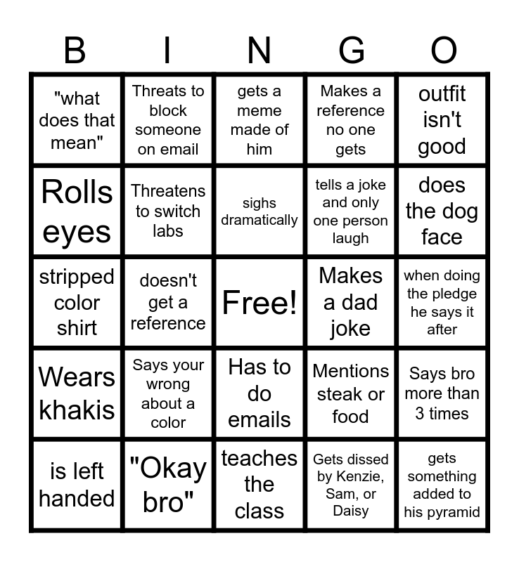 This bingo card has a free space and 24 words: Says your wrong about a color, "Okay bro", sighs dramatically, is left handed, outfit isn't good, "what does that mean", Rolls eyes, Threats to block someone on email, Makes a dad joke, Has to do emails, tells a joke and only one person laugh, stripped color shirt, Mentions steak or food, Says bro more than 3 times, Threatens to switch labs, Gets dissed by Kenzie, Sam, or Daisy, when doing the pledge he says it after, gets a meme made of him, does the dog face, doesn't get a reference, gets something added to his pyramid, Wears khakis, Makes a reference no one gets and teaches the class.