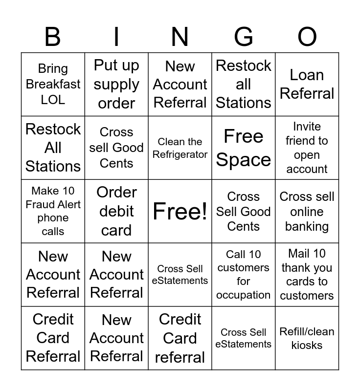 This bingo card has a free space and 24 words: New Account Referral, New Account Referral, Clean the Refrigerator, Credit Card Referral, Loan Referral, Bring Breakfast LOL, Restock All Stations, Put up supply order, Cross Sell Good Cents, Cross Sell eStatements, Free Space, Make 10 Fraud Alert phone calls, Call 10 customers for occupation, Mail 10 thank you cards to customers, Cross sell Good Cents, Cross Sell eStatements, Cross sell online banking, New Account Referral, Invite friend to open account, Order debit card, Refill/clean kiosks, New Account Referral, Restock all Stations and Credit Card referral.