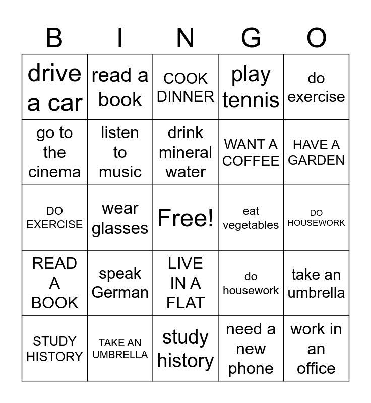 This bingo card has a free space and 47 words: want a coffee, work in an office, have a garden, study history, speak German, live in a flat, read a book, like animals, go to the cinema, watch TV, listen to music, play tennis, take an umbrella, do housework, play the guitar, say sorry, drink mineral water, eat vegetables, cook dinner, do exercise, wear glasses, need a new phone, drive a car, WANT A COFFEE, WORK IN AN OFFICE, HAVE A GARDEN, STUDY HISTORY, SPEAK GERMAN, LIVE IN A FLAT, READ A BOOK, LIKE ANIMALS, GO TO THE CINEMA, WATCH TV, LISTEN TO MUSIC, PLAY TENNIS, TAKE AN UMBRELLA, DO HOUSEWORK, PLAY THE GUITAR, SAY SORRY, DRINK MINERAL WATER, EAT VEGETABLES, COOK DINNER, DO EXERCISE, WEAR GLASSES, NEED A NEW PHONE, DRIVE A CAR and DO HOMEWORK.