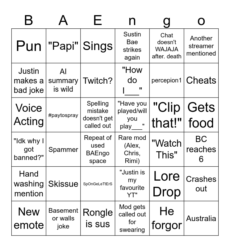 This bingo card has 36 words: "Justin is my favourite YT", SpOnGeLeTtErS, Mod gets called out for swearing, Justin makes a bad joke, "Idk why I got banned?", "Have you played/will you play___", AI summary is wild, Rongle is sus, Chat doesn't WAJAJA after. death, Lore Drop, Cheats, Sustin Bae strikes again, Crashes out, #paytospray, "How do I___", Pun, Hand washing mention, "Clip that!", Voice Acting, Sings, Spelling mistake doesn't get called out, Spammer, Rare mod (Alex, Chris, Rimi), Repeat of used BAEngo space, "Watch This", "Papi", percepion1, Basement or walls joke, Twitch?, Another streamer mentioned, Australia, New emote, BC reaches 6, Gets food, Skissue and He forgor.