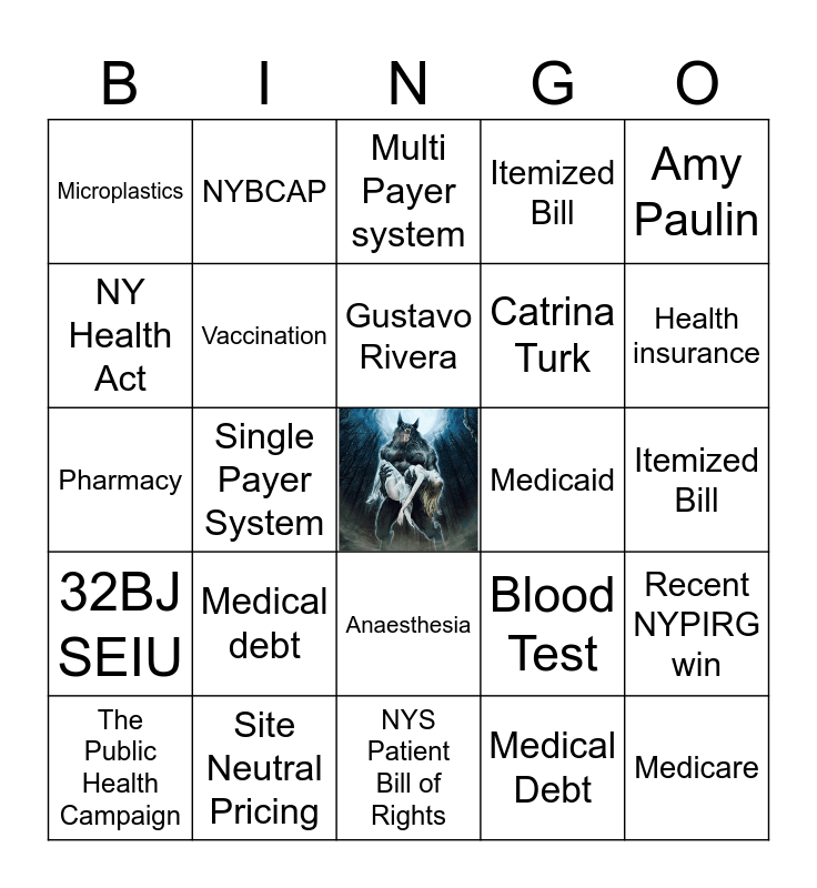 This bingo card has a free space and 24 words: Medical debt, Site Neutral Pricing, Gustavo Rivera, The Public Health Campaign, Amy Paulin, Microplastics, NY Health Act, NYBCAP, Medicaid, Anaesthesia, Catrina Turk, Pharmacy, Blood Test, Recent NYPIRG win, Vaccination, Medical Debt, Itemized Bill, Multi Payer system, Health insurance, Single Payer System, Medicare, 32BJ SEIU, Itemized Bill and NYS Patient Bill of Rights.