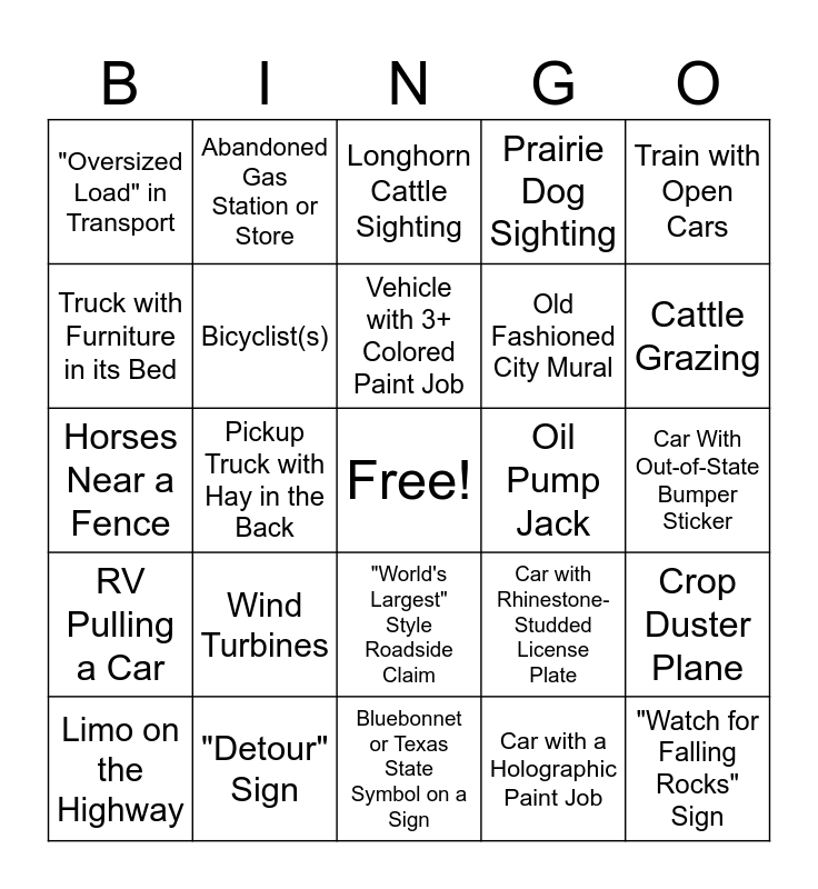 This bingo card has a free space and 34 words: Town Named After Food, Car with a Holographic Paint Job, Motorcycle Group, Car Carrier w/only 2 Cars on it, RV Pulling a Car, Bicyclist(s), Train with Open Cars, Limo on the Highway, Abandoned Gas Station or Store, Dog Sticking its Head Out the Window, Vehicle with 3+ Colored Paint Job, Longhorn Cattle Sighting, Hay Bales in Transport, Funny Version of "Baby on Board" Decal, Oil Pump Jack, Cattle Grazing, "Detour" Sign, Horses Near a Fence, Wind Turbines, Car with Rhinestone-Studded License Plate, "World's Largest" Style Roadside Claim, Livestock Trailer, "Oversized Load" in Transport, Car With Out-of-State Bumper Sticker, Bluebonnet or Texas State Symbol on a Sign, "Watch for Falling Rocks" Sign, Prairie Dog Sighting, Deer Sighting, Old Fashioned City Mural, Truck with Furniture in its Bed, Tractor on the Road, Pickup Truck with Hay in the Back, Crop Duster Plane and Fields Being Watered.