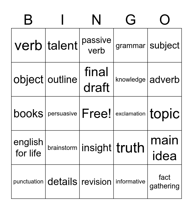 This bingo card has a free space and 25 words: brainstorm, revision, final draft, punctuation, subject, verb, object, talent, exclamation, insight, knowledge, books, truth, main idea, outline, edit, topic, passive verb, adverb, persuasive, fact gathering, details, english for life, grammar and informative.