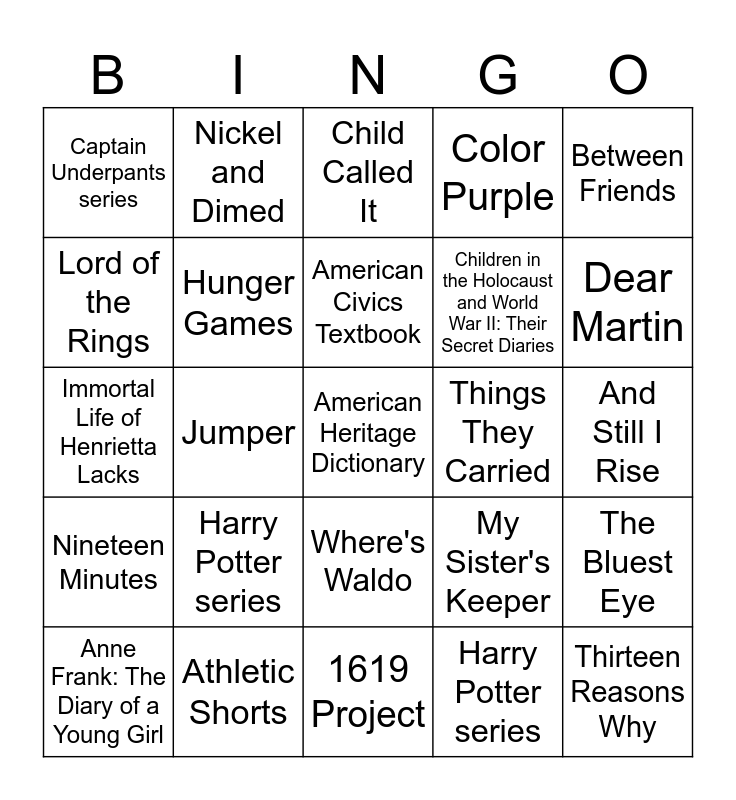 This bingo card has a free space and 25 words: Harry Potter series, 1619 Project, American Civics Textbook, Anne Frank: The Diary of a Young Girl, Between Friends, Captain Underpants series, Lord of the Rings, Nickel and Dimed, Things They Carried, Where's Waldo, Children in the Holocaust and World War II: Their Secret Diaries, Immortal Life of Henrietta Lacks, My Sister's Keeper, The Bluest Eye, Hunger Games, The Hate U Give, And Still I Rise, Child Called It, Dear Martin, Jumper, Thirteen Reasons Why, Athletic Shorts, Nineteen Minutes, Color Purple and Harry Potter series.
