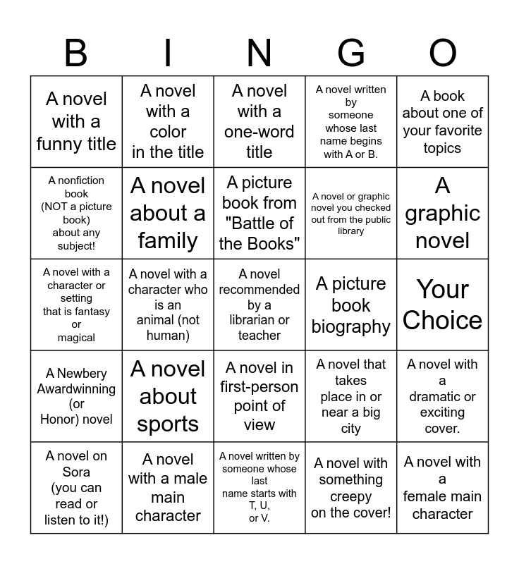 This bingo card has 25 words: A novel about sports, A novel written by someone whose last name starts with T, U, or V., A picture book from "Battle of the Books", A novel on Sora (you can read or listen to it!), A book about one of your favorite topics, A novel with a funny title, A nonfiction book (NOT a picture book) about any subject!, A novel with a color in the title, A picture book biography, A novel in first-person point of view, A novel or graphic novel you checked out from the public library, A novel with a character or setting that is fantasy or magical, A novel that takes place in or near a big city, A novel with a dramatic or exciting cover., A novel about a family, A novel with a female main character, Your Choice, A novel with a one-word title, A graphic novel, A novel with a character who is an animal (not human), A novel recommended by a librarian or teacher, A novel with a male main character, A Newbery Awardwinning (or Honor) novel, A novel written by someone whose last name begins with A or B. and A novel with something creepy on the cover!.