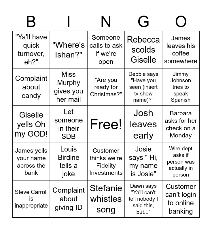 This bingo card has a free space and 24 words: Louis Birdine tells a joke, Complaint about giving ID, "Are you ready for Christmas?", Steve Carroll is inappropriate, James leaves his coffee somewhere, "Ya'll have quick turnover, eh?", Complaint about candy, "Where's Ishan?", Josh leaves early, Customer thinks we're Fidelity Investments, Debbie says "Have you seen (insert tv show name)?", Giselle yells Oh my GOD!, Josie says " Hi, my name is Josie", Wire dept asks if person was actually in person, Miss Murphy gives you her mail, Dawn says "Ya'll can't tell nobody I said this, but...", Barbara asks for her check on a Monday, Someone calls to ask if we're open, Jimmy Johnson tries to speak Spanish, Let someone in their SDB, Customer can't login to online banking, James yells your name across the bank, Rebecca scolds Giselle and Stefanie whistles song.
