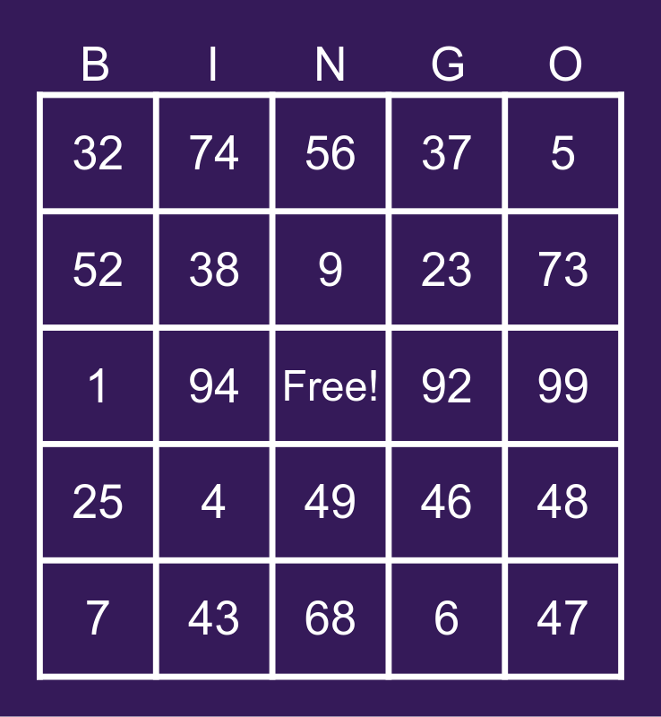 This bingo card has a free space and 24 words: 7, 4, 9, 6, 5, 32, 74, 56, 92, 99, 1, 38, 46, 48, 52, 43, 68, 37, 73, 25, 94, 49, 23 and 47.