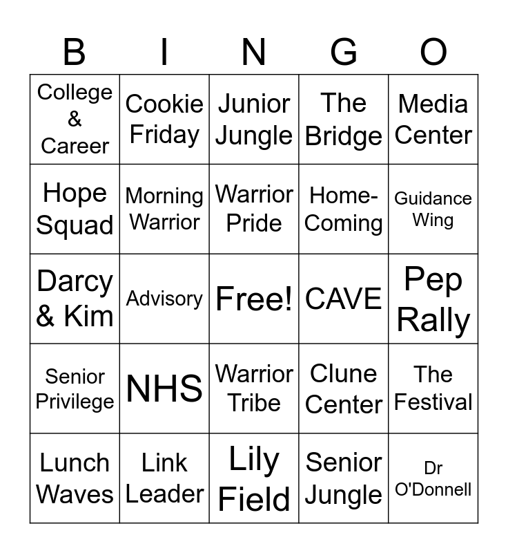 This bingo card has a free space and 24 words: Lunch Waves, NHS, Warrior Pride, Senior Jungle, Media Center, College & Career, Cookie Friday, Junior Jungle, CAVE, Pep Rally, Darcy & Kim, Morning Warrior, Clune Center, The Festival, Hope Squad, Link Leader, Lily Field, The Bridge, Guidance Wing, Senior Privilege, Advisory, Warrior Tribe, Home- Coming and Dr O'Donnell.