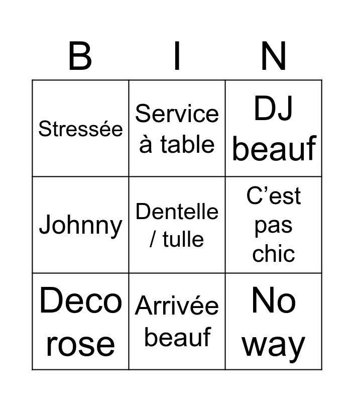 This bingo card has a free space and 8 words: C’est pas chic, DJ beauf, Service à table, Deco rose, Stressée, No way, Johnny and Arrivée beauf.