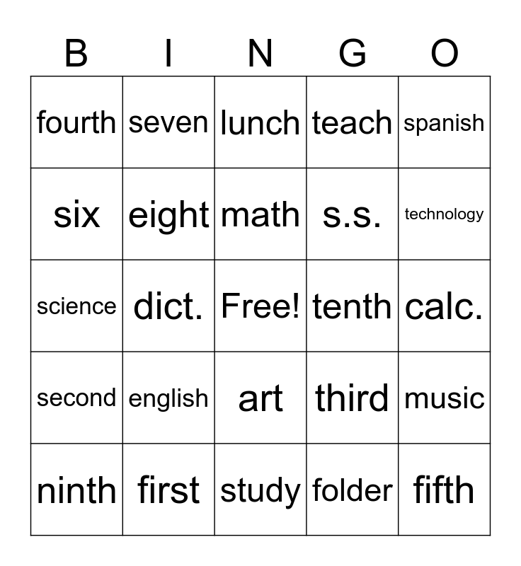 This bingo card has a free space and 24 words: english, first, math, ninth, spanish, fourth, six, seven, tenth, art, s.s., science, third, music, eight, folder, calc., lunch, technology, dict., fifth, second, teach and study.