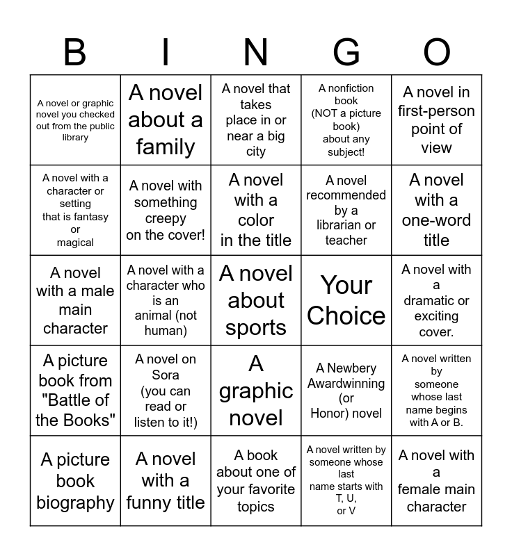 This bingo card has 25 words: A novel on Sora (you can read or listen to it!), A book about one of your favorite topics, A novel with a color in the title, A picture book biography, A novel in first-person point of view, A novel or graphic novel you checked out from the public library, A novel with a character or setting that is fantasy or magical, A novel about a family, Your Choice, A graphic novel, A novel recommended by a librarian or teacher, A novel with a male main character, A Newbery Awardwinning (or Honor) novel, A novel written by someone whose last name begins with A or B., A novel with something creepy on the cover!, A novel with a female main character, A novel with a dramatic or exciting cover., A novel that takes place in or near a big city, A novel with a one-word title, A novel with a character who is an animal (not human), A novel about sports, A novel with a funny title, A picture book from "Battle of the Books", A nonfiction book (NOT a picture book) about any subject! and A novel written by someone whose last name starts with T, U, or V.