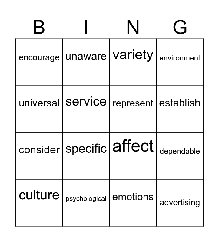 This bingo card has 16 words: culture, psychological, variety, environment, universal, unaware, affect, dependable, encourage, service, emotions, establish, consider, specific, represent and advertising.