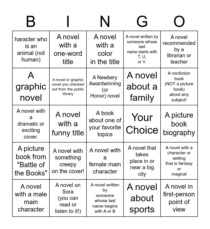 This bingo card has 25 words: A novel with something creepy on the cover!, A novel written by someone whose last name begins with A or B, A Newbery Awardwinning (or Honor) novel, A novel with a male main character, A novel recommended by a librarian or teacher, haracter who is an animal (not human), A graphic novel, A novel with a one-word title, Your Choice, A novel with a female main character, A novel about a family, A novel with a dramatic or exciting cover., A novel that takes place in or near a big city, A novel with a character or setting that is fantasy or magical, A novel or graphic novel you checked out from the public library, A novel in first-person point of view, A picture book biography, A novel with a color in the title, A nonfiction book (NOT a picture book) about any subject!, A novel with a funny title, A book about one of your favorite topics, A novel on Sora (you can read or listen to it!), A picture book from "Battle of the Books", A novel written by someone whose last name starts with T, U, or V. and A novel about sports.