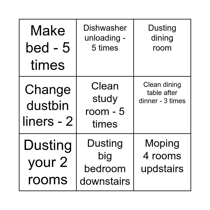 This bingo card has a free space and 8 words: Clean dining table after dinner - 3 times, Dusting dining room, Dishwasher unloading - 5 times, Dusting your 2 rooms, Make bed - 5 times, Moping 4 rooms updstairs, Change dustbin liners - 2 and Dusting big bedroom downstairs.