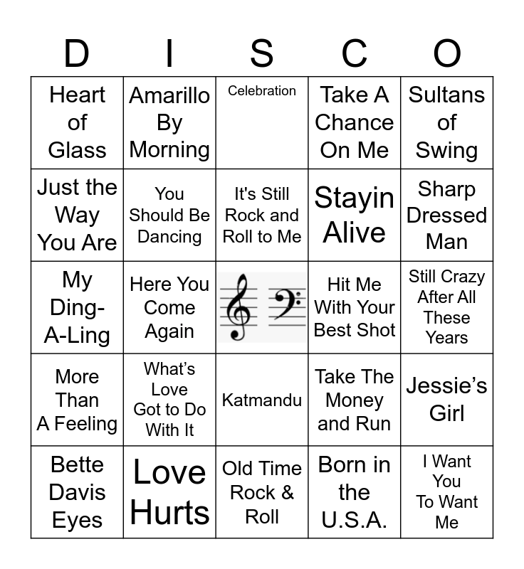 This bingo card has a free space and 60 words: Love Will Keep Us Together, Love Hurts, Come Sail Away, More Than A Feeling, Born in the U.S.A., The Power of Love, You Should Be Dancing, Silly Love Songs, Stayin Alive, How Deep is Your Love, Take A Chance On Me, Livin’ Thing, Just the Way You Are, We Are The Champions, We Will Rock You, Heart of Glass, I Want You To Want Me, Sultans of Swing, The Logical Song, It's Still Rock and Roll to Me, Hit Me With Your Best Shot, Celebration, Bette Davis Eyes, Jessie’s Girl, I Love Rock and Roll, Who Can It Be Now, Abra-cadabra, Photograph, Sharp Dressed Man, Come on Feel The Noize, Dancing In the Dark, The Gambler, I Love A Rainy Night, Mountain Music, Amarillo By Morning, Don’t It Make My Brown Eyes Blue, Sleeping Single In A Double Bed, Here You Come Again, Always On My Mind, My Ding-A-Ling, Laughter In the Rain, What’s Love Got to Do With It, Still Crazy After All These Years, Gone At Last, Take The Money and Run, Jet Airliner, Jungle Love, Rock and Roll Music, Ghost Riders in the Sky, Katmandu, Old Time Rock & Roll, Centerfold, You Ain’t Seen Nothing Yet, Don’t Bring Me Down, Rock This Town, Late In The Evening, If You Don’t Know Me by Now, Funky town, Break My Stride and Islands in the Stream.
