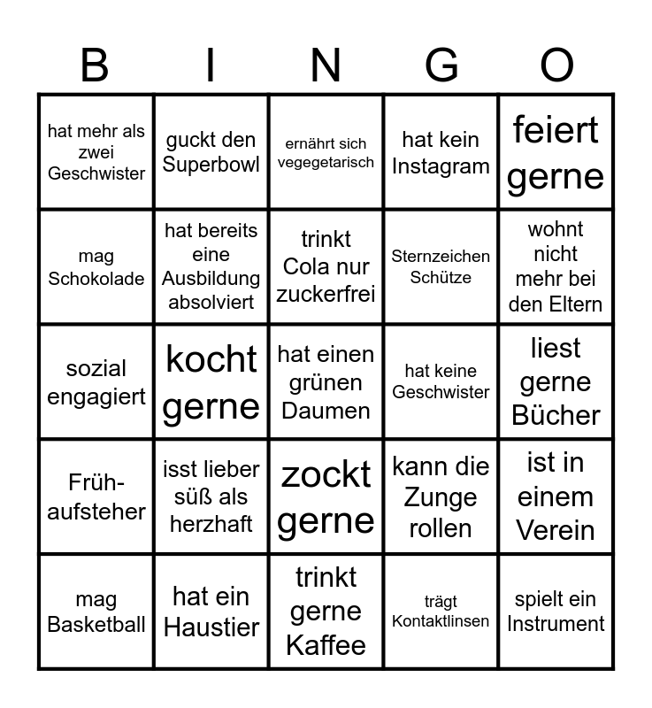 This bingo card has 30 words: hat ein Haustier, mag Eis, kocht gerne, trinkt gerne Apfelschorle, hat mehr als zwei Geschwister, ernährt sich vegegetarisch, hat bereits eine Ausbildung absolviert, zockt gerne, hat keine Geschwister, trinkt gerne Kaffee, liest gerne Bücher, hat einen grünen Daumen, trägt Kontaktlinsen, spielt ein Instrument, wohnt nicht mehr bei den Eltern, ist Links-händer, kann die Zunge rollen, Früh-aufsteher, isst lieber süß als herzhaft, feiert gerne, sozial engagiert, macht regelmäßig Sport, guckt den Superbowl, Sternzeichen Schütze, mag Schokolade, hat kein Instagram, ist in einem Verein, mag Basketball, trinkt Cola nur zuckerfrei and wohnt in Leverkusen.