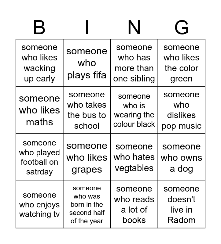 This bingo card has 16 words: someone who was born in the second half of the year, someone who owns a dog, someone who has more than one sibling, someone who likes wacking up early, someone who played football on satrday, someone who plays fifa, someone who hates vegtables, someone who reads a lot of books, someone who likes maths, someone who takes the bus to school, someone who enjoys watching tv, someone who likes the color green, someone who likes grapes, someone who dislikes pop music, someone who is wearing the colour black and someone doesn't live in Radom.