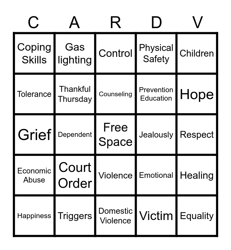 This bingo card has a free space and 44 words: Power, Equality, Abuse, Happiness, Survivor, Victim, Control, Safety Planning, Children, Triggers, Physical Safety, Jealously, Violence, Court Order, LOVE, Domestic Violence, Advocate, Grief, Depression, Hope, Gas lighting, Assertive, Offender, Coping Skills, Boundaries, Respect, Identity, Loss, Emotional, Economic Abuse, Recovery, Healing, Digital Abuse, Code Words, Dependent, Hotline, Shelter, Empathy, Counseling, Tolerance, Prevention Education, DVAM, Thankful Thursday and Sexual Assault.