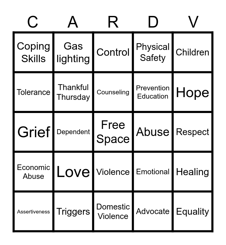 This bingo card has a free space and 44 words: Power, Equality, Jealously, Assertiveness, Survivor, Advocate, Control, Safety Planning, Children, Triggers, Physical Safety, Abuse, Violence, Love, Court Order, Domestic Violence, Victim, Grief, Depression, Hope, Gas lighting, Happiness, Offender, Coping Skills, Boundaries, Respect, Identity, Loss, Emotional, Economic Abuse, Recovery, Healing, Digital Abuse, Code Words, Dependent, Hotline, Shelter, Empathy, Counseling, Tolerance, Prevention Education, DVAM, Thankful Thursday and Sexual Assault.
