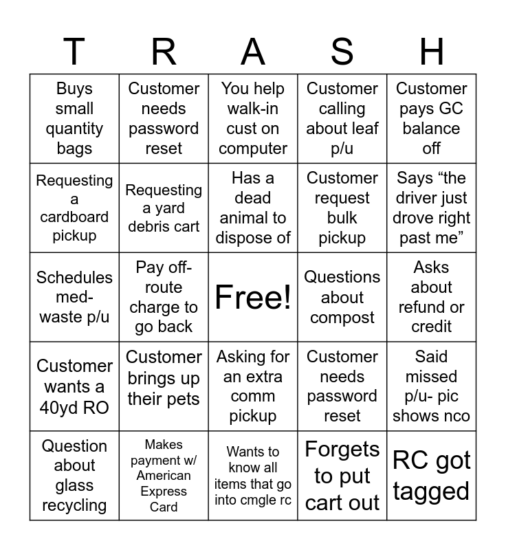 This bingo card has a free space and 24 words: Customer brings up their pets, Makes payment w/ American Express Card, Has a dead animal to dispose of, Question about glass recycling, Customer pays GC balance off, Buys small quantity bags, Requesting a cardboard pickup, Customer needs password reset, Questions about compost, Asking for an extra comm pickup, Customer request bulk pickup, Schedules med-waste p/u, Customer needs password reset, Said missed p/u- pic shows nco, Requesting a yard debris cart, Forgets to put cart out, Asks about refund or credit, You help walk-in cust on computer, Says “the driver just drove right past me”, Pay off-route charge to go back, RC got tagged, Customer wants a 40yd RO, Customer calling about leaf p/u and Wants to know all items that go into cmgle rc.