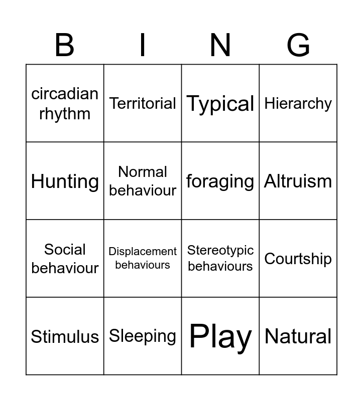 This bingo card has 20 words: Courtship, Atypical, Typical, Grooming, Stimulus, Hunting, Sleeping, circadian rhythm, Social behaviour, Territorial, Displacement behaviours, Stereotypic behaviours, Normal behaviour, Natural, foraging, fight/flight, Altruism, Hierarchy, Play and Vacuum behaviour.