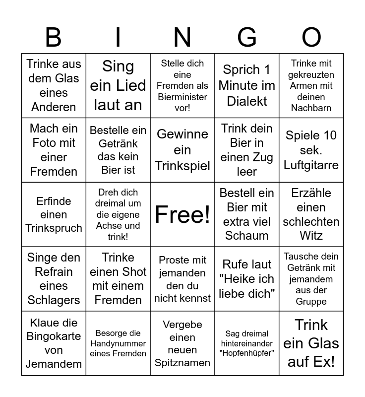 This bingo card has a free space and 24 words: Trinke einen Shot mit einem Fremden, Besorge die Handynummer eines Fremden, Gewinne ein Trinkspiel, Klaue die Bingokarte von Jemandem, Trinke mit gekreuzten Armen mit deinen Nachbarn, Trinke aus dem Glas eines Anderen, Mach ein Foto mit einer Fremden, Sing ein Lied laut an, Bestell ein Bier mit extra viel Schaum, Proste mit jemanden den du nicht kennst, Trink dein Bier in einen Zug leer, Erfinde einen Trinkspruch, Rufe laut "Heike ich liebe dich", Tausche dein Getränk mit jemandem aus der Gruppe, Bestelle ein Getränk das kein Bier ist, Sag dreimal hintereinander "Hopfenhüpfer", Erzähle einen schlechten Witz, Stelle dich eine Fremden als Bierminister vor!, Spiele 10 sek. Luftgitarre, Dreh dich dreimal um die eigene Achse und trink!, Trink ein Glas auf Ex!, Singe den Refrain eines Schlagers, Sprich 1 Minute im Dialekt and Vergebe einen neuen Spitznamen.