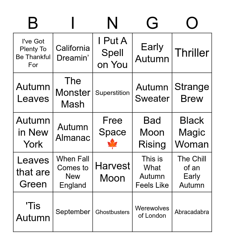 This bingo card has a free space and 27 words: This is What Autumn Feels Like, Forever Autumn, Autumn Sweater, Ghostbusters, Autumn Leaves, I Put A Spell on You, California Dreamin’, Leaves that are Green, Bad Moon Rising, The Chill of an Early Autumn, Autumn in New York, Early Autumn, 'Tis Autumn, September, Strange Brew, Autumn Serenade, The Monster Mash, Superstition, When Fall Comes to New England, I've Got Plenty To Be Thankful For, Black Magic Woman, Werewolves of London, Autumn Almanac, Abracadabra, Harvest Moon, Thriller and Coat of Many Colors.