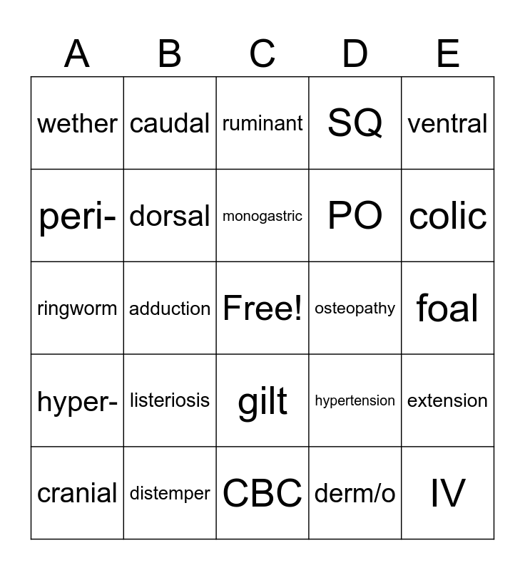 This bingo card has a free space and 34 words: cardi/o, derm/o, -itis, hypo-, hyper-, dorsal, ventral, cranial, caudal, distal, monogastric, ruminant, avian, hindgut fermenter, osteopathy, colic, distemper, ringworm, listeriosis, hypertension, gilt, colt, wether, foal, CBC, IV, SQ, IM, PO, peri-, supra-, adduction, extension and pronation.