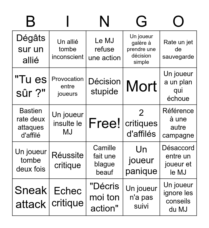 This bingo card has a free space and 24 words: Réussite critique, Echec critique, Décision stupide, Sneak attack, Rate un jet de sauvegarde, Dégâts sur un allié, "Tu es sûr ?", Un allié tombe inconscient, 2 critiques d'affilés, Camille fait une blague beauf, Mort, Bastien rate deux attaques d'affilé, Un joueur panique, Désaccord entre un joueur et le MJ, Provocation entre joueurs, Un joueur n'a pas suivi, Référence à une autre campagne, Le MJ refuse une action, Un joueur a un plan qui échoue, Un joueur insulte le MJ, Un joueur ignore les conseils du MJ, Un joueur tombe deux fois, Un joueur galère à prendre une décision simple and "Décris moi ton action".