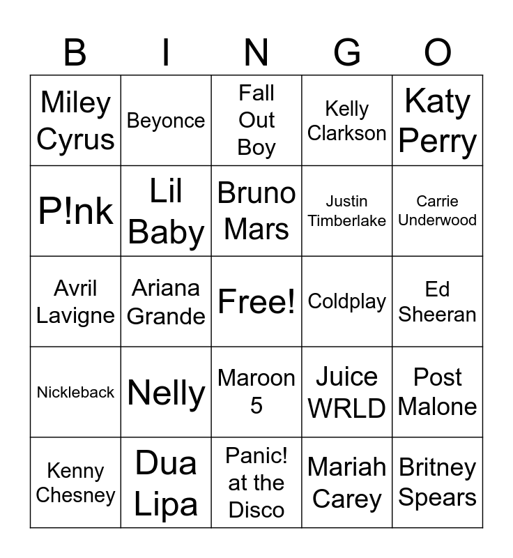 This bingo card has a free space and 67 words: Taylor Swift, Drake, Rihanna, Post Malone, Eminem, The Weeknd, Beyonce, Justin Bieber, Bruno Mars, Usher, Maroon 5, Morgan Wallen, Ed Sheeran, Katy Perry, Lady Gaga, P!nk, Ariana Grande, Miley Cyrus, Black Eyed Peas, Justin Timberlake, Nelly, Nickleback, Kelly Clarkson, Mariah Carey, Jay-Z, Lil Wayne, 50 Cent, Kendrick Lamar, Carrie Underwood, Billie Eilisah, Britney Spears, Nicki Manaj, Linkin Park, Imagine Dragons, Luke Combs, Kenny Chesney, Future, Juice WRLD, Avril Lavigne, Olivia Rodrigo, Travis Scott, Lil Baby, Coldplay, Luke Bryan, Toby Keith, Doja Cat, Creed, Dua Lipa, OutKast, Kesha, Fall Out Boy, 3 Doors Down, One Direction, The Chainsmokers, Daft Punk, Panic! at the Disco, Blink-182, Sabrina Carpenter, Arctic Monkeys, Tyler the Creator, Fleetwood Mac, Gorillaz, Green Day, Elton John, Red Hot Chili Peppers, Chappel Roan and The Goo Goo Dolls.