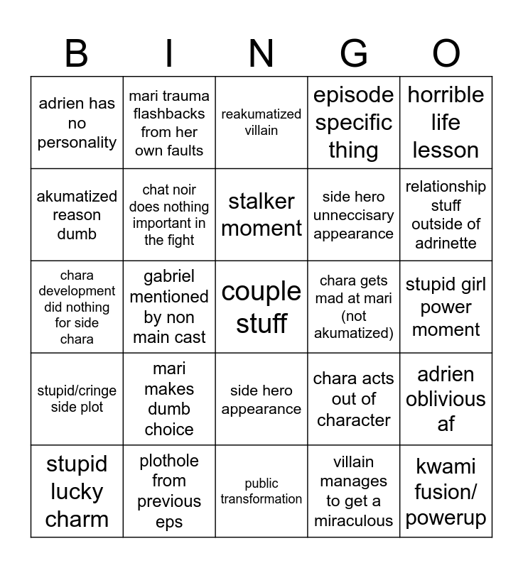 This bingo card has a free space and 24 words: mari makes dumb choice, plothole from previous eps, stalker moment, stupid lucky charm, horrible life lesson, adrien has no personality, akumatized reason dumb, mari trauma flashbacks from her own faults, chara gets mad at mari (not akumatized), side hero appearance, side hero unneccisary appearance, chara development did nothing for side chara, chara acts out of character, adrien oblivious af, chat noir does nothing important in the fight, villain manages to get a miraculous, stupid girl power moment, reakumatized villain, relationship stuff outside of adrinette, gabriel mentioned by non main cast, kwami fusion/ powerup, stupid/cringe side plot, episode specific thing and public transformation.