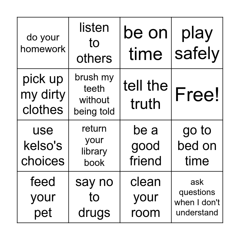 This bingo card has 17 words: clean your room, feed your pet, be on time, do your homework, return your library book, play safely, go to bed on time, tell the truth, Free!, brush my teeth without being told, say no to drugs, be a good friend, pick up my dirty clothes, listen to others, use kelso's choices, raise my hand to talk and ask questions when I don't understand.