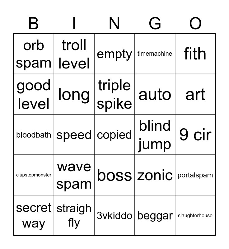 This bingo card has a free space and 24 words: wave spam, straigh fly, triple spike, secret way, fith, orb spam, good level, troll level, blind jump, boss, auto, bloodbath, zonic, portalspam, long, beggar, 9 cir, empty, art, speed, slaughterhouse, clupstepmonster, timemachine and 3vkiddo.