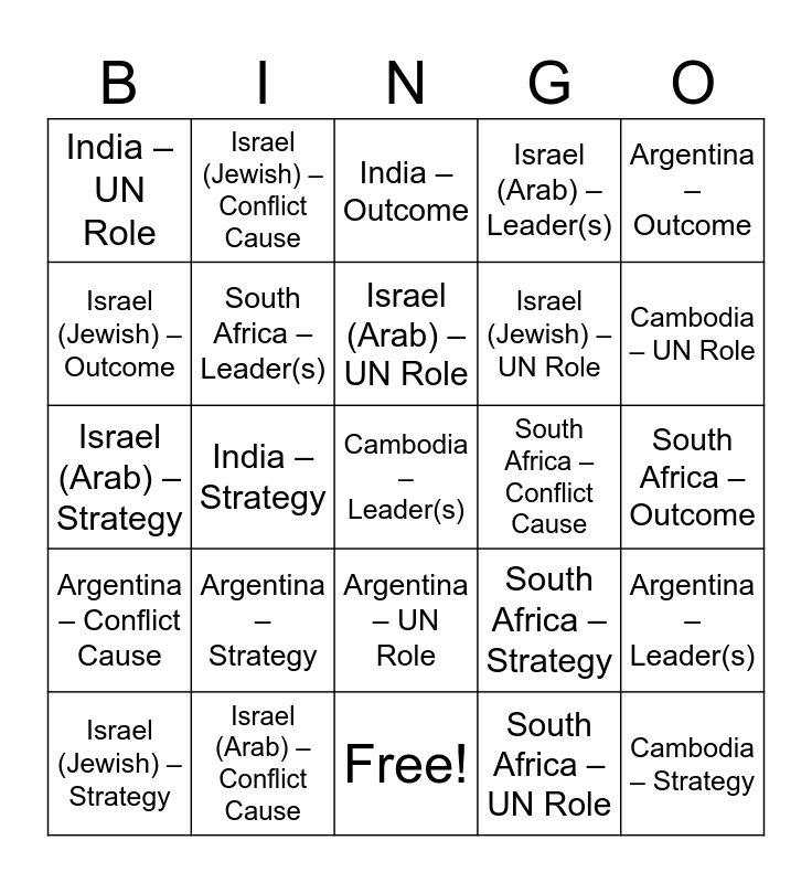 This bingo card has 31 words: Free!, India – Leader(s), India – Strategy, India – Conflict Cause, India – UN Role, India – Outcome, South Africa – Leader(s), South Africa – Strategy, South Africa – Conflict Cause, South Africa – UN Role, South Africa – Outcome, Cambodia – Leader(s), Cambodia – Strategy, Cambodia – Conflict Cause, Cambodia – UN Role, Cambodia – Outcome, Argentina – Leader(s), Argentina – Strategy, Argentina – Conflict Cause, Argentina – UN Role, Argentina – Outcome, Israel (Jewish) – Leader(s), Israel (Jewish) – Strategy, Israel (Jewish) – Conflict Cause, Israel (Jewish) – UN Role, Israel (Jewish) – Outcome, Israel (Arab) – Leader(s), Israel (Arab) – Strategy, Israel (Arab) – Conflict Cause, Israel (Arab) – UN Role and Israel (Arab) – Outcome.