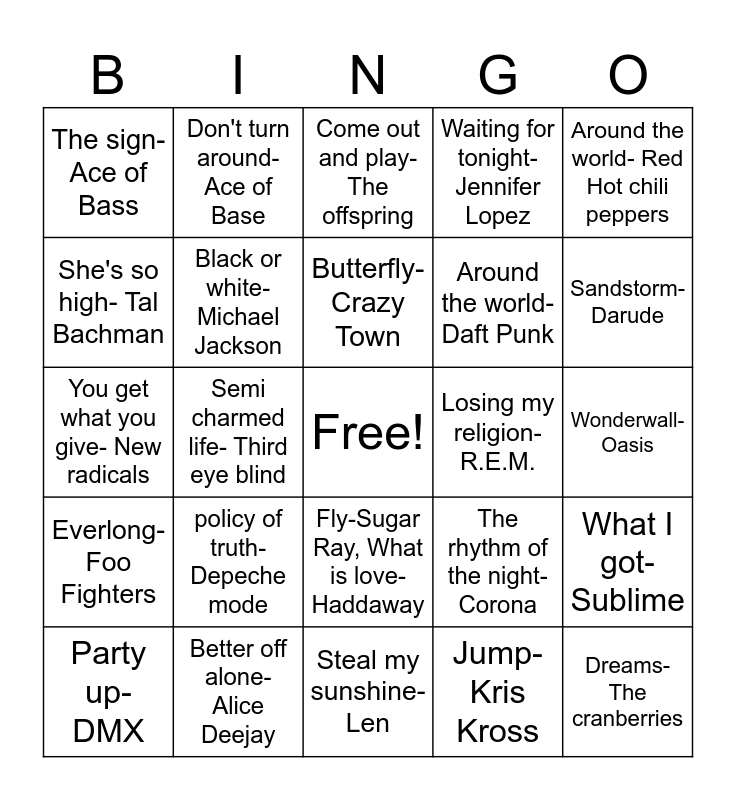 This bingo card has a free space and 63 words: Fly Away- Lenny Kravitz, Don't Speak-No Doubt, Another night- Real McCoy, What I got- Sublime, Self Esteem- The Offspring, I'm every woman- Whitney Houston, Don't turn around-Ace of Base, Everybody-Backstreet Boys, Butterfly-Crazy Town, Enjoy the silence-Depeche mode, Fly-Sugar Ray, What is love-Haddaway, I See- Letters to Cleo, Wonderwall-Oasis, Around the world- Red Hot chili peppers, Cherub Rock-Smaching Pumpkins, She's so high- Tal Bachman, Semi charmed life- Third eye blind, The sign- Ace of Bass, The bad touch- Bloodhound gang, Around the world- Daft Punk, policy of truth- Depeche mode, Everlong-Foo Fighters, Waiting for tonight-Jennifer Lopez, My own worst enemy- Lit, U can't touch this- M. C. Hammer, Step by Step- New kids on the block, Clumsy-Our lady peace, Californication-Red hot chili peppers, Rhythm is a dancer-Snap!, Let forever be- The chemical brothers, No Scrubs-TLC, You Oughta know-Alanis Morissette, Song 2- Blur, Brimful of Asha-Cornershop, Sandstorm- Darude, Party up- DMX, Close to you- Fun Factory, Jump- Kris Kross, Macarena- Los Del Rio, Black or white- Michael Jackson, You get what you give- New radicals, Losing my religion- R.E.M., Millennium- Robbie Williams, Black hole son-Soundgarden, Dreams- The cranberries, Better off alone- Alice Deejay, Drinking in L.A.- Bran Van 3000, The rhythm of the night-Corona, I'm afraid of Americans- David Bowie, Come undone- Duran Duran, I think I'm paranoid- Garbage, Steal my sunshine- Len, Smells like teen spirit- Nirvana, Du Hast-Rammstein, Man! I feel like a woman- Shania Twain, Come out and play- The offspring, Buddy Holly-Weezer, Barbie Girl-Aqua, Everybody dance now-Gonna make you sweat, Mr. Jones- Counting Crows, Groove is in the heart-Deee-lite, Take a picture- Filter and When I come around- Green Day.
